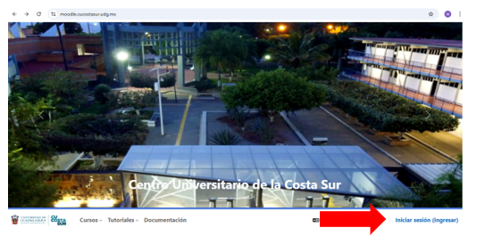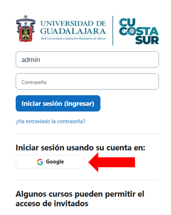 Para ingresar a la nueva versión de Moodle lo harás con tu cuenta de correo institucional con domino @alumnos.udg.mx o @academicos.udg.mx, dando click en el botón de Google.